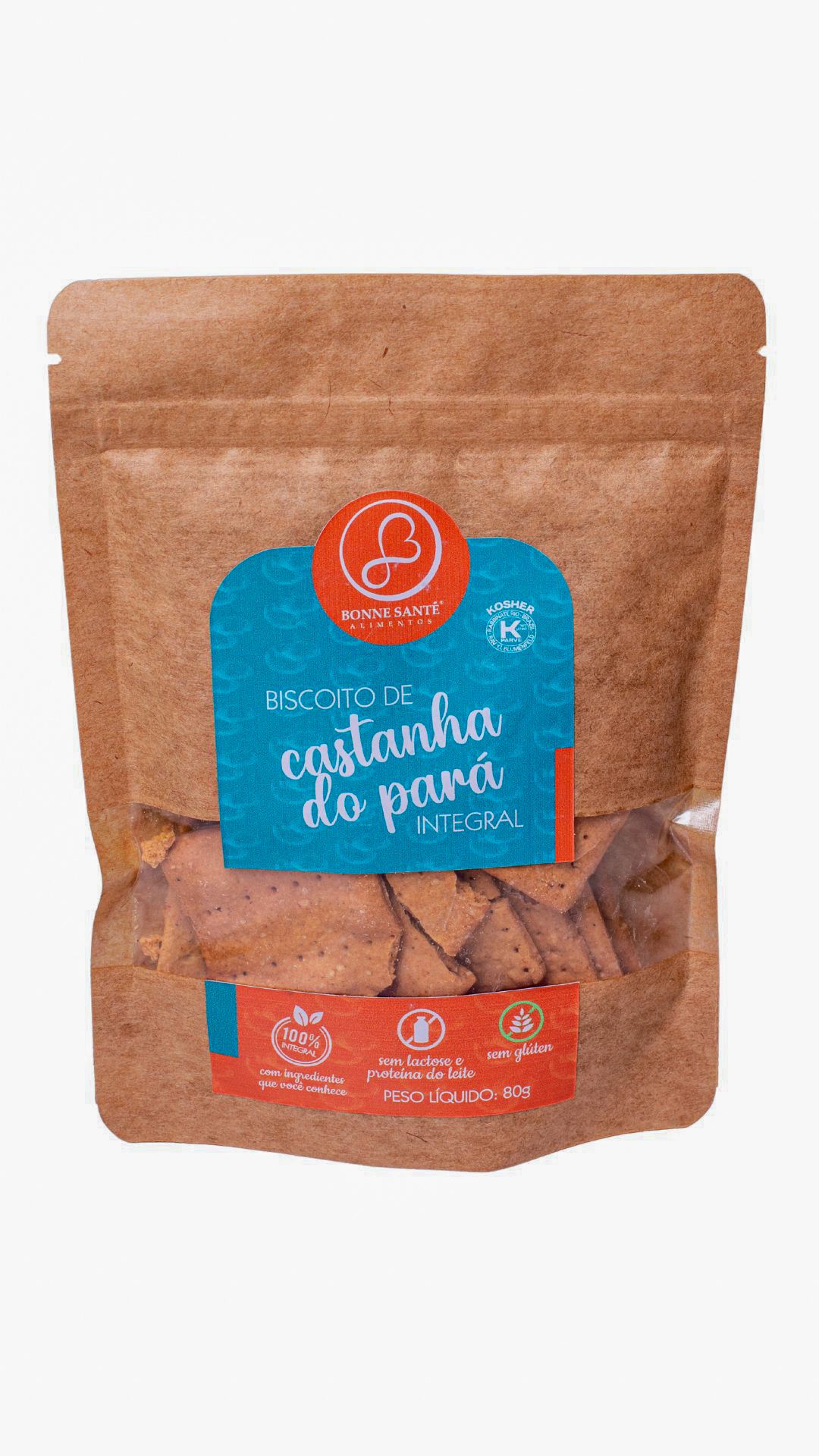 Pacote de biscoito Integral á base de castanha do pará, textura crocante.